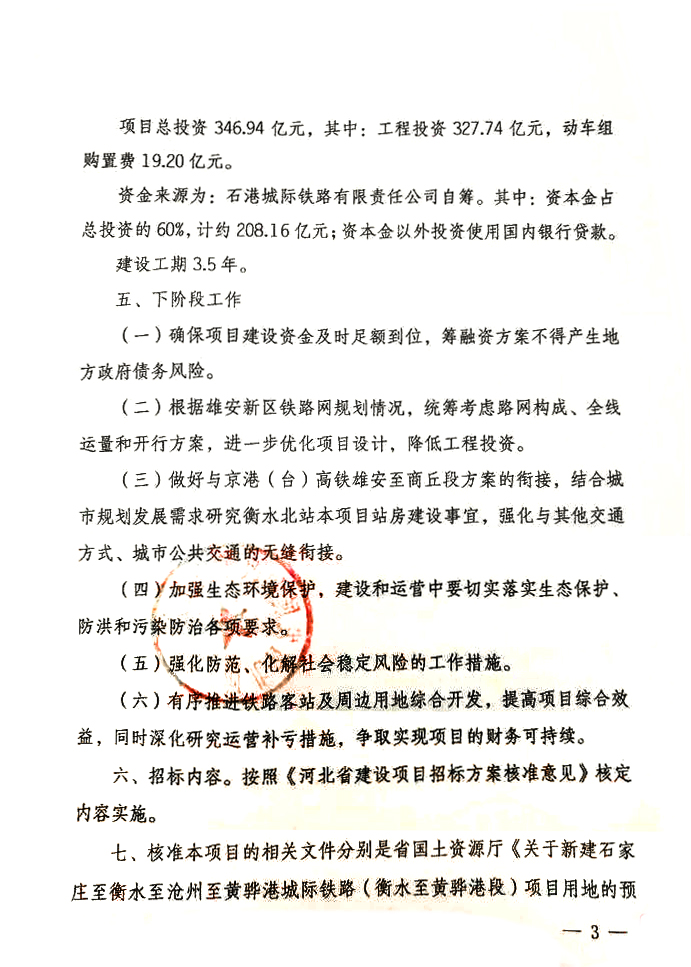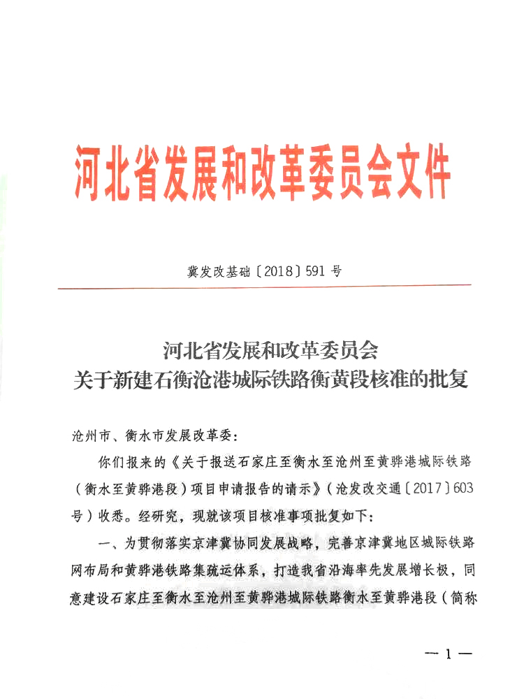 5月7日獲悉,河北省發(fā)改委日前批復(fù)了滄州及衡水市發(fā)改委報送的《關(guān)于報送石家莊至衡水至滄州至黃驊港城際鐵路(衡水至黃驊港段)項目申請報告的請示》,并印發(fā)了《冀發(fā)改基礎(chǔ)[2018]591號文件》,新建石衡滄港城際鐵路衡黃段獲得核準批復(fù)。