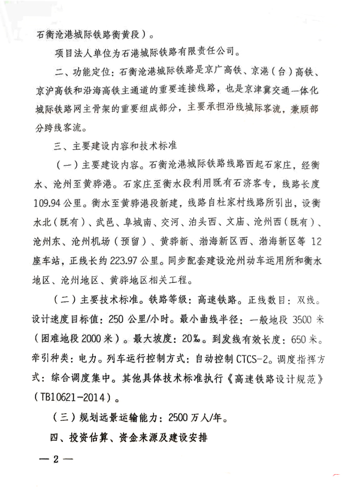 根據(jù)《石衡滄港環(huán)境影響報告書》顯示,石衡滄港城際鐵路(衡水至黃驊港段)自石濟客專衡水北站接軌,途經(jīng)衡水市、武邑縣、阜城縣和滄州的泊頭市、滄縣、滄州市、黃驊市、海興縣和渤海新區(qū)。