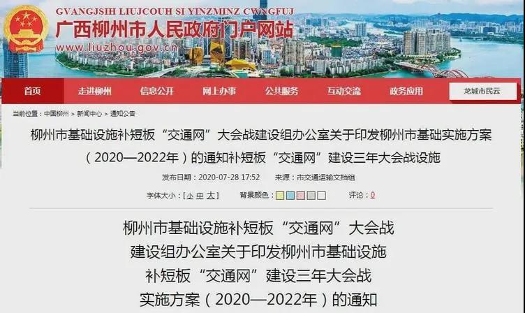 近日,柳州市人民政府門戶網(wǎng)站發(fā)布了《柳州市基礎(chǔ)設(shè)施補(bǔ)短板“交通網(wǎng)”建設(shè)三年大會戰(zhàn)實(shí)施方案(2020-2022年)》。