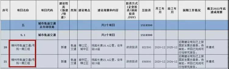 柳州交通軌道2號線一期工程,將于2020年12月開工,竣工時間2024年12月,建設(shè)地點(diǎn)為城中區(qū)、柳江區(qū),線路長度23.4公里,設(shè)車站19座。近期建設(shè)規(guī)劃已上報(bào)國家發(fā)展改革委,待審批。項(xiàng)目已完成可行性研究報(bào)告。