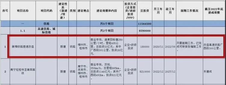 該項(xiàng)目為國鐵Ⅰ級雙線電氣化鐵路、速度目標(biāo)值160公里/小時預(yù)留200公里/小時提速條件,里程445公里,投資487億元。其中廣西段252公里,投資270億元。