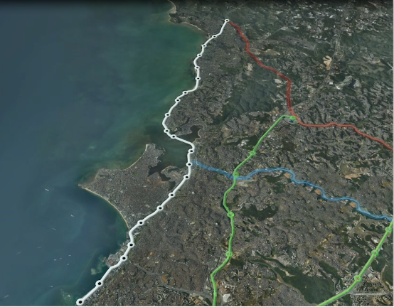 云軌地形適應(yīng)能力極強(qiáng),轉(zhuǎn)彎半徑僅為45米,爬坡能力可達(dá)10%,編組靈活,單向運(yùn)能為1-3萬人/小時(shí),被招標(biāo)小組認(rèn)為“十分符合”規(guī)定的相關(guān)技術(shù)指標(biāo),且云軌在低空運(yùn)行的特點(diǎn)也成為加分項(xiàng)之一——完全契合薩爾瓦多打造“沿海旅游走廊”的發(fā)展規(guī)劃:軌道交通在空中運(yùn)行,不占用道路面積,且視野極佳,地面則可修建自行車道和海邊休閑步道。