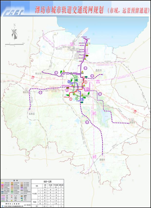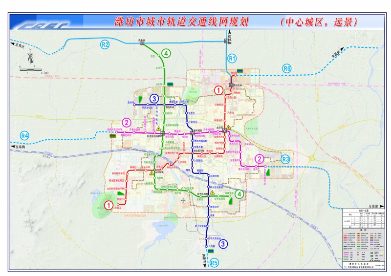 線網(wǎng)規(guī)劃由6條線路組成,其中1、2、3、4號線為市區(qū)線,R1、R2線為市域線,全網(wǎng)線路全長201.3公里,共設(shè)置車站116座。近期建設(shè)項目由1號線一期工程、2號線組成。其中1號線一期工程自山水環(huán)保至物流園,正線長度24.166公里,設(shè)站21座;2號線自濰城開發(fā)區(qū)中學至呂家張營社區(qū),正線長度26.496公里,設(shè)站22座。