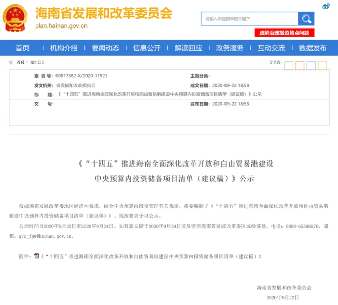 9月22日,海南發(fā)改委公布了《“十四五”推進海南全面深化改革開放和自由貿(mào)易港建設中央預算內(nèi)投資儲備項目清單(建議稿)》。