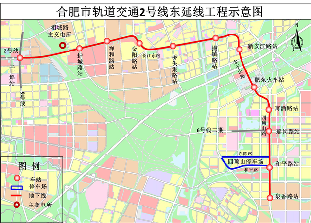 今天開工的2號線東延線起于2號線終點(diǎn)站三十埠站,出站后線路依次沿著長江東路、規(guī)劃太子山路和規(guī)劃四頂山路敷設(shè),止于四頂山路與泉香路交叉口的泉香路站,線路全長約14.5公里,全部為地下線。共布置11座車站,分別為護(hù)城路站、祥和路站、金陽路站、橋頭集路站、撮鎮(zhèn)路站、新安江路站、肥東火車站、寓酒路站、瑤崗路站、和平路站和泉香路站。