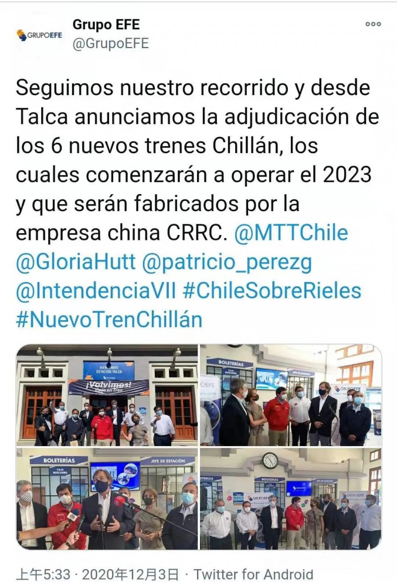 2019年5月,智利國(guó)家鐵路公司與中車四方公司確認(rèn),將增購(gòu)2列電動(dòng)車組,將項(xiàng)目中的電力列車總數(shù)提升至12列。