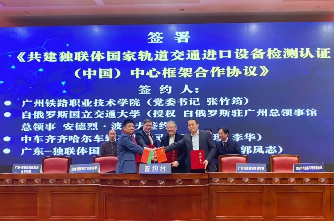 北京時(shí)間12月4日,在廣東省“一帶一路”職業(yè)教育聯(lián)盟年會(huì)上,廣州鐵路職業(yè)技術(shù)學(xué)院、白俄羅斯國(guó)立交通大學(xué)、中車齊齊哈爾車輛有限公司及廣東-獨(dú)聯(lián)體國(guó)際科技合作聯(lián)盟共同簽署了“共建獨(dú)聯(lián)體國(guó)家軌道交通進(jìn)口設(shè)備檢測(cè)認(rèn)證()中心框架合作協(xié)議”。