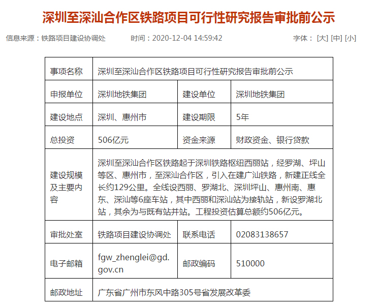 根據(jù)公示內(nèi)容,項(xiàng)目建設(shè)單位為深圳地鐵集團(tuán),建設(shè)地點(diǎn)為深圳、惠州市,建設(shè)期限5年。項(xiàng)目總投資506億元,建設(shè)資金來自財(cái)政資金和銀行貸款。