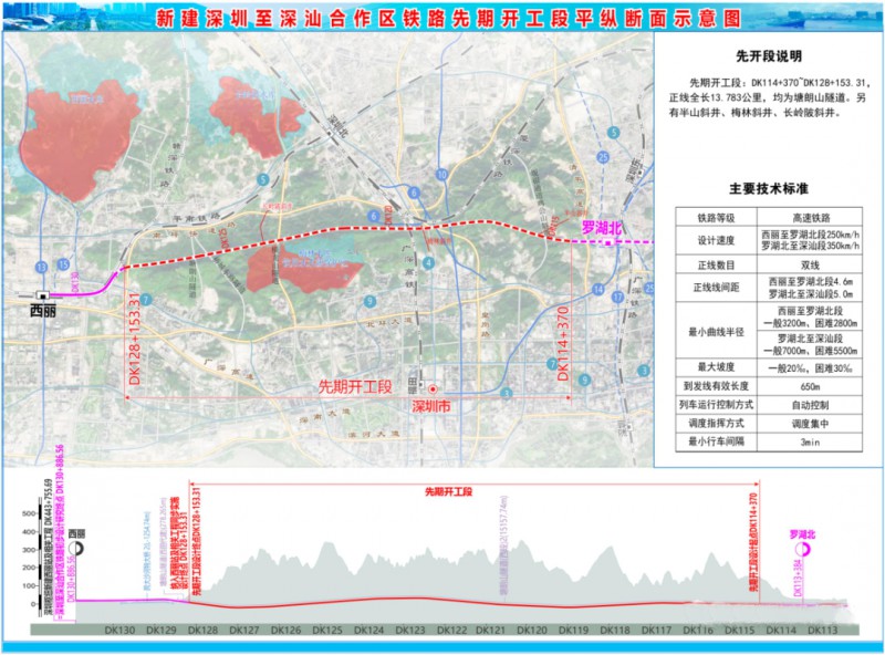 深圳至深汕合作區(qū)鐵路起于深圳鐵路樞紐西麗站,經(jīng)羅湖、坪山等區(qū)、惠州市,至深汕合作區(qū),引入在建廣汕鐵路,新建正線全長(zhǎng)約129公里。