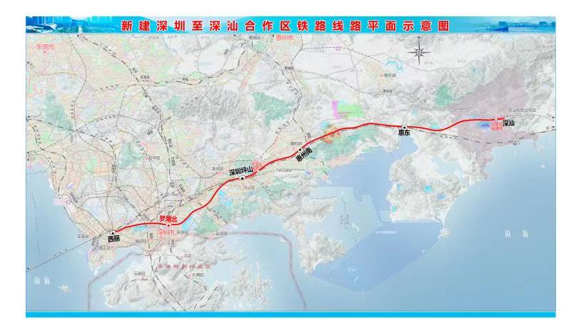 深汕鐵路起自深圳西麗站,經(jīng)羅湖北站、深圳站、坪山站、惠州南站、惠東站至深汕合作區(qū)深汕站,線路全長(zhǎng)約126公里,設(shè)計(jì)時(shí)速350公里。該鐵路是國(guó)家“八橫八縱”高速鐵路網(wǎng)中沿海通道的重要組成部分,是粵港澳大灣區(qū)向東輻射的重要載體,線路在深汕合作區(qū)深汕站銜接廣汕鐵路,并進(jìn)一步延伸至長(zhǎng)三角地區(qū),不僅加強(qiáng)了我市及粵港澳大灣區(qū)與海峽西岸經(jīng)濟(jì)帶、長(zhǎng)三角等城市群的快速聯(lián)系,還能帶動(dòng)深汕合作區(qū)的培育和發(fā)展,對(duì)提升我市及大灣區(qū)對(duì)外輻射力、促進(jìn)深圳與粵東地區(qū)一體化發(fā)展具有重要意義。