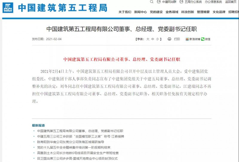 2021年2月4日上午,建筑第五工程局有限公司召開中層及以上管理人員大會。受中建集團黨組委托,中建集團干部人事部負責同志宣布了中建集團黨組關于中建五局董事、總經(jīng)理、黨委副書記調(diào)整補充的決定:劉冬同志任建筑第五工程局有限公司董事、總經(jīng)理、黨委副書記,江建端同志不再擔任建筑第五工程局有限公司董事、總經(jīng)理、黨委副書記職務。相關職務任免按有關規(guī)定程序辦理。