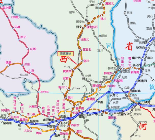 新建西安至延安高速鐵路自西安北站、西安東站引出,經(jīng)西安市高陵區(qū)、閻良區(qū),渭南市富平縣,銅川市耀州區(qū)、王益區(qū)、印臺(tái)區(qū)、宜君縣,延安市黃陵縣、洛川縣、富縣、甘泉縣和寶塔區(qū),至既有包西鐵路延安站。