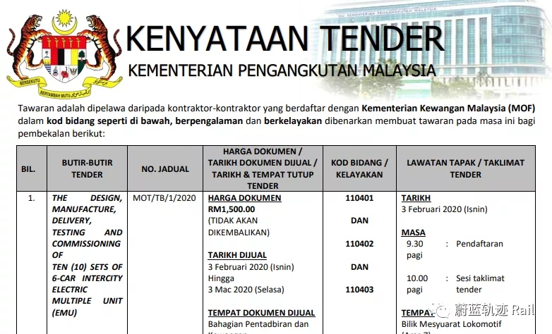 2020年1月,馬來(lái)亞鐵道公司發(fā)布招標(biāo)信息,將采購(gòu)10列全新列車。