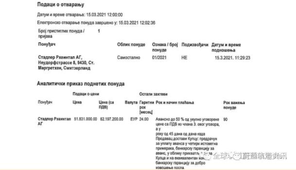 當(dāng)?shù)貢r(shí)間4月5日,國家鐵路公司正式將列車訂單給予Stadler,訂單價(jià)值達(dá)6219萬歐元(超出采購預(yù)算1100萬歐元)。根據(jù)計(jì)劃,全新列車將運(yùn)行在貝爾格萊德至諾維薩德的高速鐵路上。