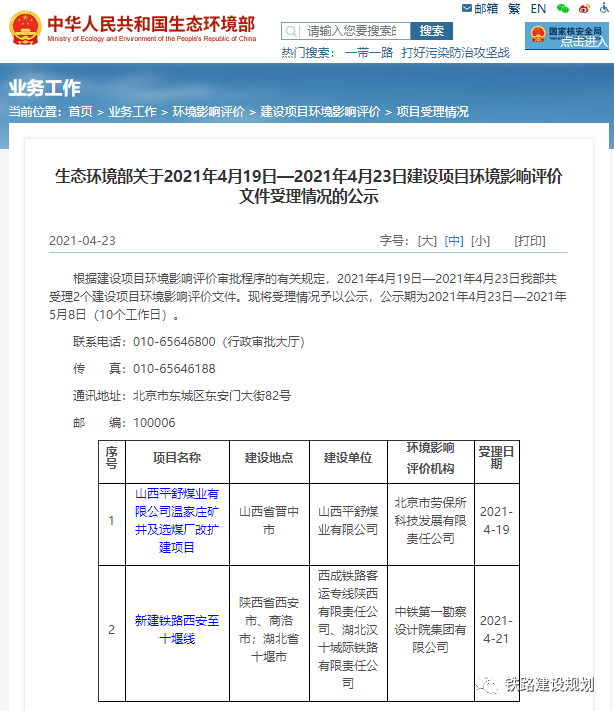 423日,生態(tài)環(huán)境部公布了《關(guān)于2021419日—2021423日建設(shè)項(xiàng)目環(huán)境影響評(píng)價(jià)文件受理情況的公示》,西安至十堰高鐵位列其中,公示期為2021423-58日。預(yù)示著西十高鐵環(huán)評(píng)報(bào)告即將批復(fù)。