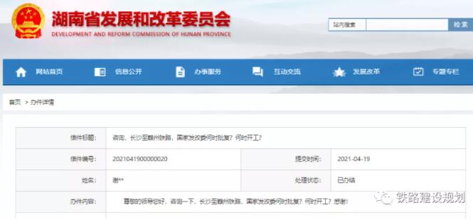 422日,湖南省發(fā)改委在答復(fù)網(wǎng)友關(guān)于長(zhǎng)贛高鐵何時(shí)開(kāi)工的問(wèn)題時(shí)回復(fù):