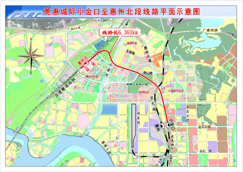 莞惠城際北延線自既有莞惠城際小金口站北端引出,沿惠州大道向北走行,以隧道形式下穿京九鐵路后折向西,經(jīng)麒麟山森林公園至倚山路走行,下穿小金河后,展線折向西南上跨倚山路,并行贛深高鐵引入惠州北站,沿途不新設(shè)站點(diǎn)。
