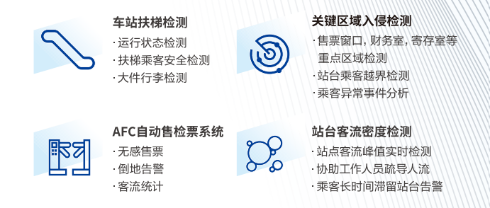 基于寒武紀(jì)云端MLU270智能加速卡,通過集中處理的方式有效提高站內(nèi)多路視頻推理能力,降低客戶采購(gòu)成本,提高客站運(yùn)營(yíng)效率;通過搭載寒武紀(jì)邊緣端MLU220智能加速卡,實(shí)現(xiàn)邊緣側(cè)產(chǎn)品在寬溫環(huán)境中穩(wěn)定工作,大大提升邊緣側(cè)AI算力的可靠性。云邊協(xié)同的解決方案可廣泛用于車站扶梯檢測(cè)、關(guān)鍵區(qū)域入侵檢測(cè)、AFC自動(dòng)售檢票系統(tǒng)、站臺(tái)客流密度檢測(cè)等場(chǎng)景,助力軌道交通車站更高效地應(yīng)對(duì)復(fù)雜現(xiàn)場(chǎng)的挑戰(zhàn)。