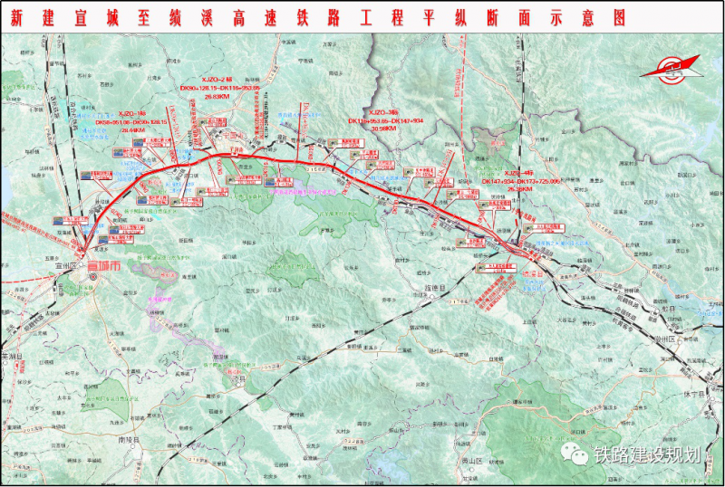 宣績高鐵位于安徽省境內(nèi),線路自宣城站引出,向東南經(jīng)寧國市,再折向南至績溪北站。正線全長111.6公里,設(shè)計時速350公里,共設(shè)宣城、寧國南、績溪北3座車站,設(shè)十里巖線路所1座。