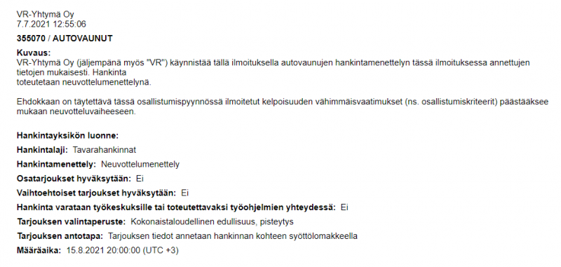 2021年2月,芬蘭鐵路公司正式啟動流程,發(fā)出招標邀請,將通過協(xié)商程序采購全新動車組列車。候選人必須符合招標文件(征集意向書中)規(guī)定的最低資格標準,才可進入談判階段。