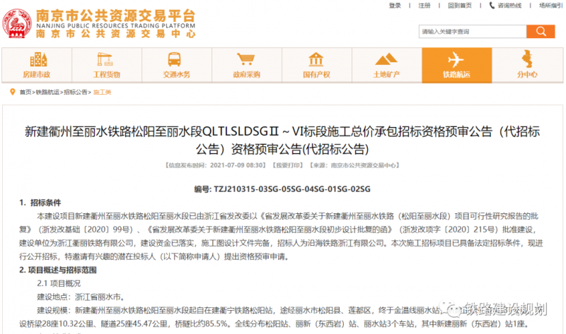 7月9日,《新建衢州至麗水鐵路松陽至麗水段QLTLSLDSGⅡ~Ⅵ標(biāo)段施工總價承包招標(biāo)資格預(yù)審公告》在南京市公共資源交易中心發(fā)布。