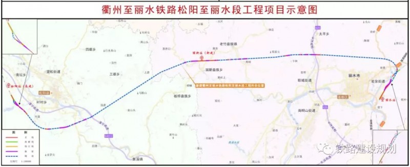 新建衢州至麗水鐵路松陽至麗水段起自在建衢寧鐵路松陽站,途經(jīng)麗水市松陽縣、蓮都區(qū),終于金溫線麗水站,新建正線長度65.30公里。新設(shè)橋梁28座10.32公里、隧道25座45.47公里,橋隧比約85.5%。全線分布松陽站、東西巖站、麗水站3個車站,其中新建東西巖站1座。