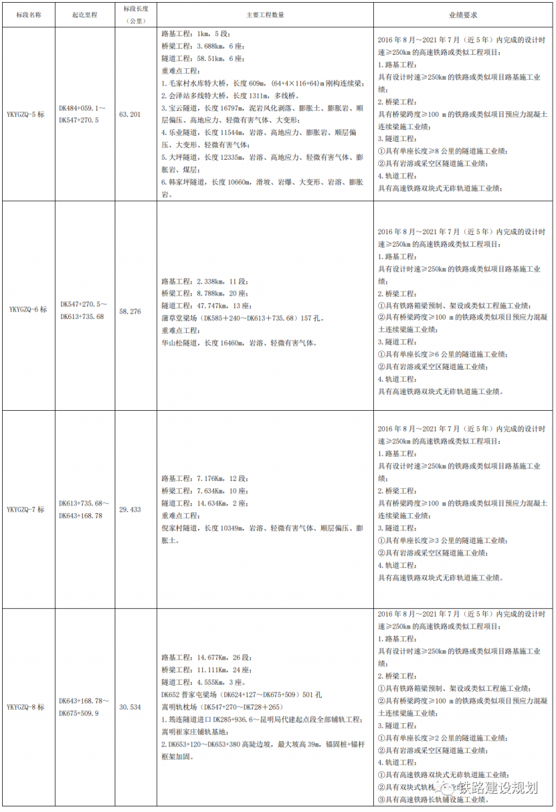 本次招標(biāo)共分為9個(gè)標(biāo)段,包括川渝段YKCYZQ-6、7兩個(gè)標(biāo)段以及云貴段YKCYZQ-1~3、5~8七個(gè)標(biāo)段(4標(biāo)段為昭通隧道)。各標(biāo)段主要工程內(nèi)容和數(shù)量詳見下表:
