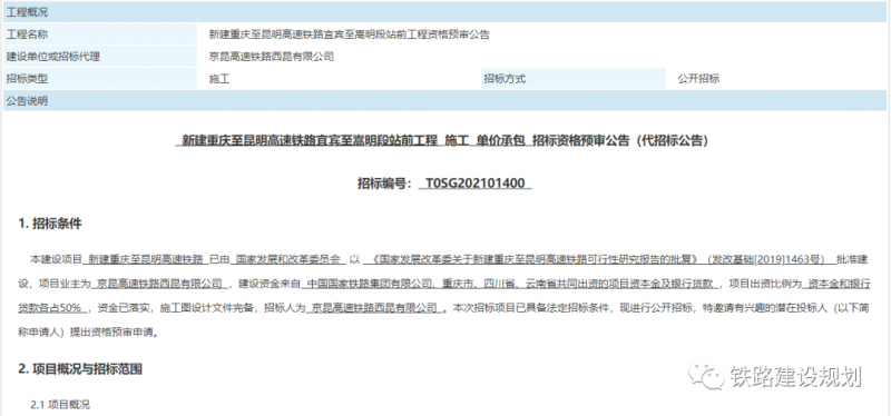 7月14日,京昆高速鐵路西昆有限公司發(fā)布了《新建重慶至昆明高速鐵路宜賓至嵩明段站前工程施工單價(jià)承包招標(biāo)資格預(yù)審公告》,渝昆高鐵宜賓至昆明段即將正式開工建設(shè)。