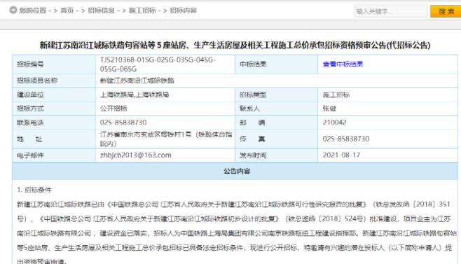 8月17日,《新建江蘇南沿江城際鐵路句容站等5座站房、生產(chǎn)生活房屋及相關(guān)工程施工總價承包招標資格預(yù)審公告》發(fā)布。
