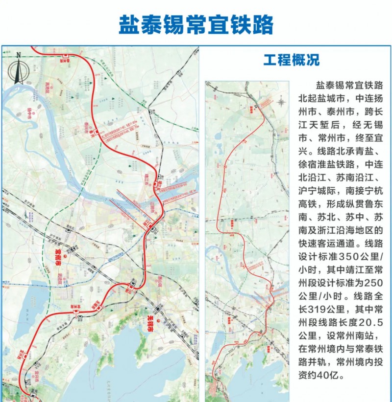 鹽泰錫常宜鐵路:起于鹽城站,向南經(jīng)興化、泰州、泰興、靖江、江陰、無錫、常州,終于宜興站,正線長約310公里,估算總投資約975.2億元,速度目標值350公里/小時,等級為高速鐵路。本項目含長江大橋一座,全長7公里,估算總投資約209.5億元。