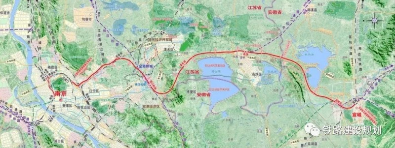 寧宣鐵路:起于南京站,向南經(jīng)南京市江寧區(qū)、祿口機場、溧水區(qū)、高淳區(qū),終至安徽省宣城市。正線長約158.5公里,其中江蘇段約117.2公里,總投資約287.5億元,除去共通道段長度后約106公里;安徽境內(nèi)正線長約41.3公里。速度目標值350公里/小時,等級為高速鐵路。