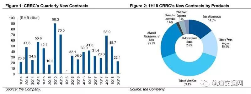 中車(01766 HK)公布 2018 年 4-6 月新簽重大合同 220.7 億元(人民幣,下同),包括 22.8 億元的機(jī)車銷售合同、6.5 億元的貨車銷售合同、119 億元的地鐵銷售合同、29.1 億元的動車組高級修合同、23.5 億元的風(fēng)力發(fā)電機(jī)銷售合同,及 19.8 億元的機(jī)電系統(tǒng)集成管理及供貨合同。總計上半年公司新簽重大合同共計 708.1 億元,同比減少 3.1%;2 季度新重大合同共計 220.7億元,同比減少 29.6%。
