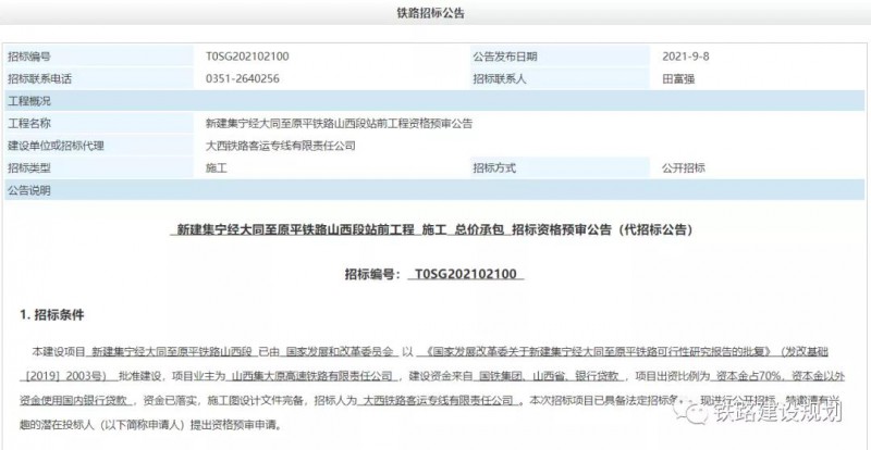 9月8日,《新建集寧經(jīng)大同至原平鐵路山西段站前工程施工總價(jià)承包招標(biāo)資格預(yù)審公告》發(fā)布,項(xiàng)目即將全線開工建設(shè)。
