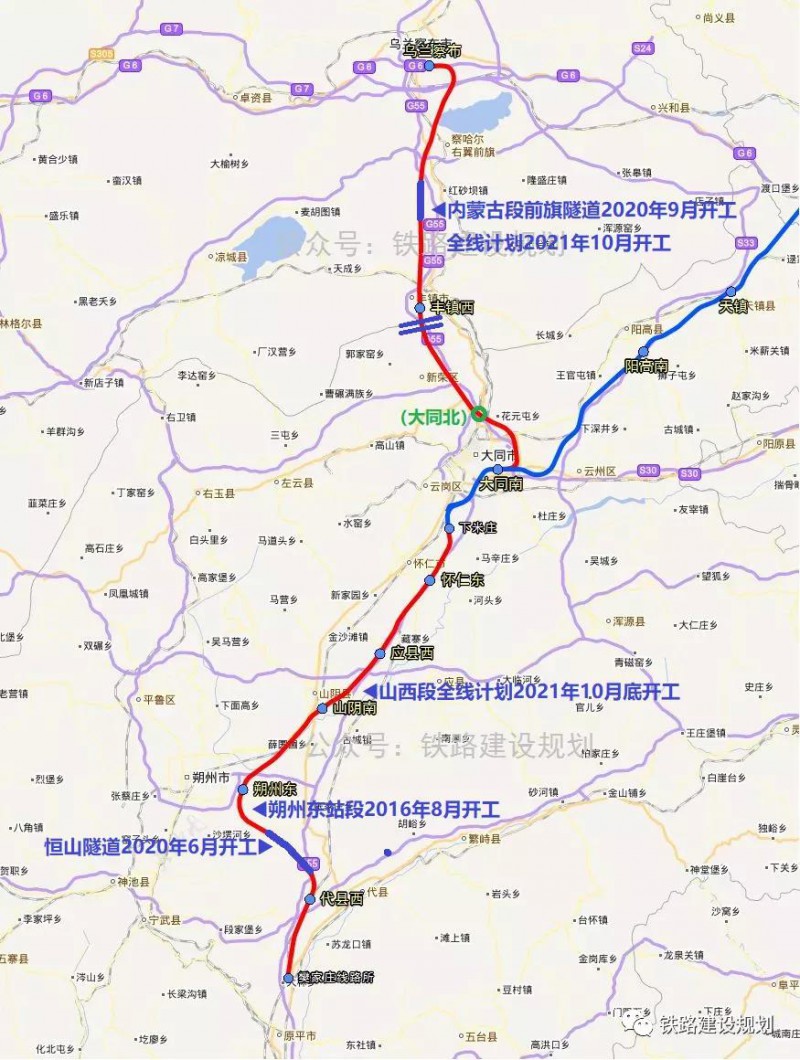 山西段前身為大原客運(yùn)專線,其中朔州東站先期開工段于2016年8月12日開工