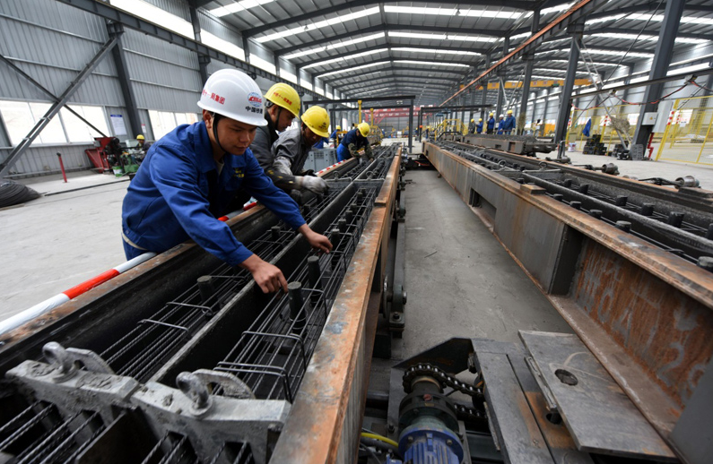 7月16日,在中鐵十一局橋梁公司曲水制枕場生產(chǎn)車間,技術(shù)人員在進行軌枕箍筋作業(yè)。