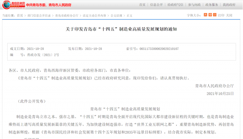 10月28日獲悉,青島市人民政府辦公廳發(fā)布關(guān)于印發(fā)青島市“十四五”制造業(yè)高質(zhì)量發(fā)展規(guī)劃的通知。