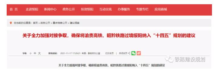 一、關(guān)于全力加強(qiáng)對接爭取,確保將渝貴高鐵、昭黔鐵路過境綏陽納入“十四五”規(guī)劃的建議