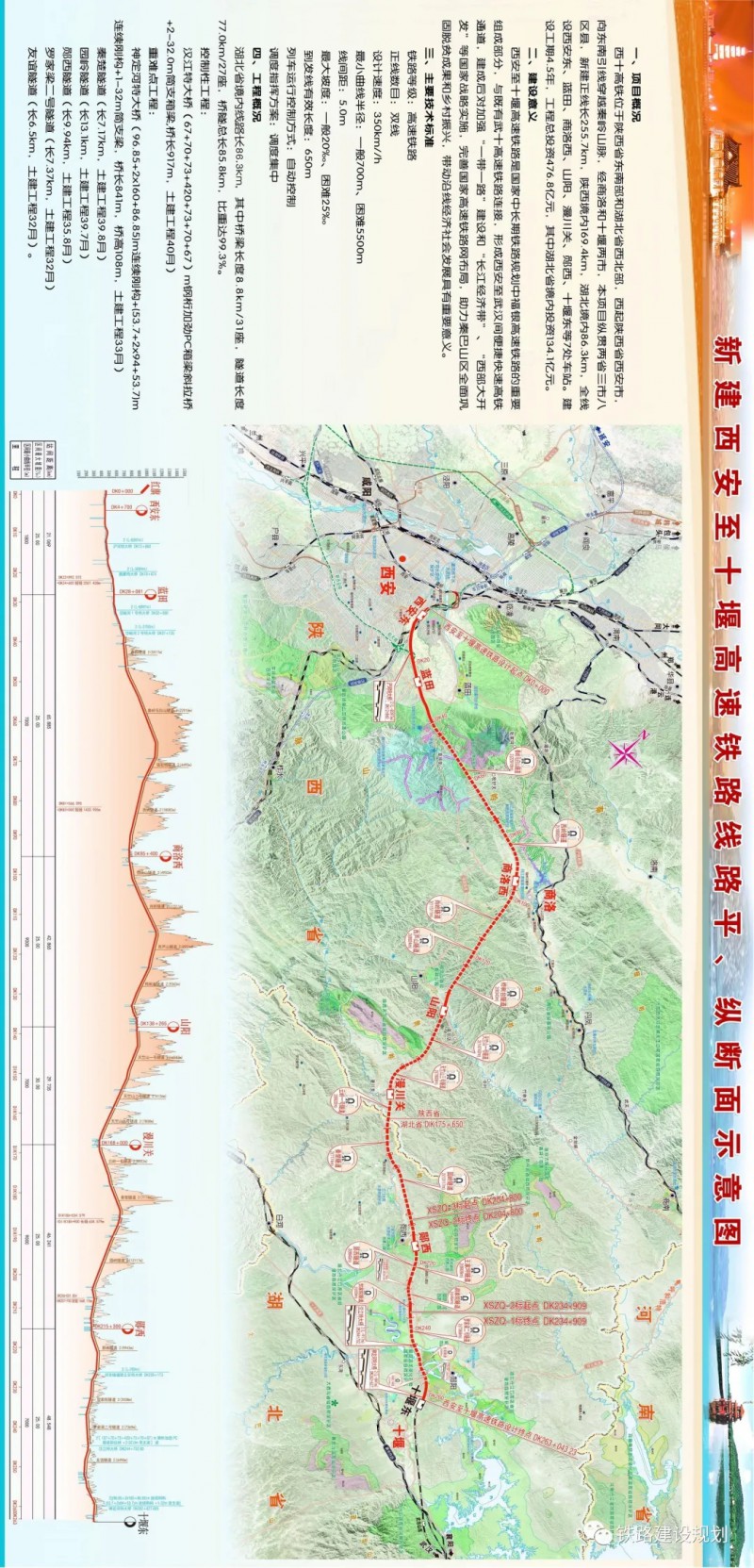 正線全長(zhǎng)255.76公里,其中湖北省境內(nèi)86.36公里,陜西省境內(nèi)169.4公里。按雙線電氣化高速鐵路標(biāo)準(zhǔn)建設(shè),設(shè)計(jì)速度目標(biāo)值為350公里/小時(shí)。