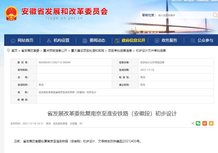 安徽省發(fā)改委消息:日前,安徽省發(fā)展和改革委員會批復南京至淮安鐵路(安徽段)初步設(shè)計,批復文號為皖發(fā)改鐵建函[2021]400號。寧淮鐵路安徽段初步設(shè)計的批復,標志著此項目建設(shè)邁出重要一步。
