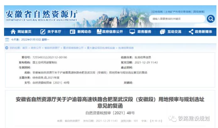 安徽省自然資源廳消息:12月29日,《安徽省自然資源廳關(guān)于滬渝蓉高速鐵路合肥至武漢段(安徽段)用地預(yù)審與規(guī)劃選址意見的復(fù)函》正式印發(fā),標(biāo)志著沿江高鐵合肥至武漢段用地預(yù)審與規(guī)劃選址正式獲批,為項(xiàng)目可研批復(fù)奠定了基礎(chǔ)。