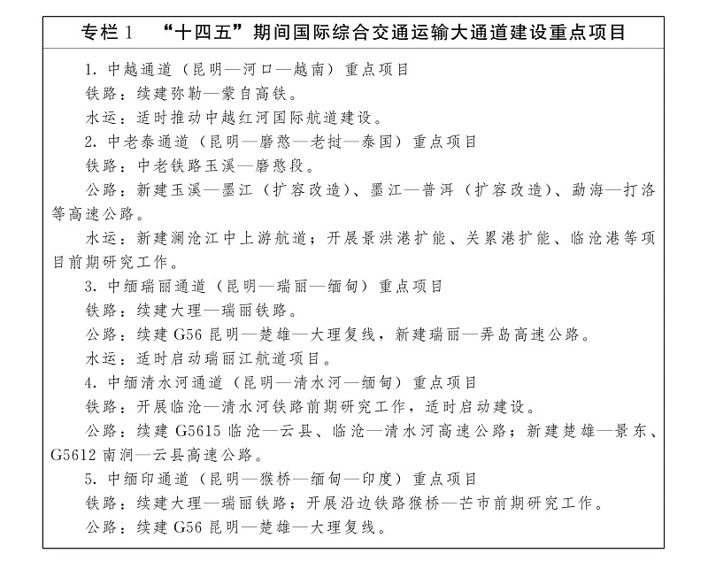 1.加快建設(shè)5條國際綜合交通運(yùn)輸大通道。推動(dòng)中越、中老泰國際運(yùn)輸通道全面暢通,推動(dòng)中緬國際運(yùn)輸通道建設(shè)取得進(jìn)展,統(tǒng)籌通道內(nèi)各種運(yùn)輸方式發(fā)展,加快通道內(nèi)鐵路建設(shè),提升通道內(nèi)公路服務(wù)能力,鞏固和拓展民航國際航線,推進(jìn)水運(yùn)航道建設(shè),提升與周邊國家交通基礎(chǔ)設(shè)施互聯(lián)互通水平,全面支撐—中南半島、孟中印緬2條國際綜合交通經(jīng)濟(jì)走廊建設(shè)。
