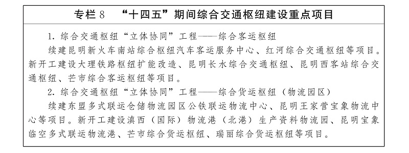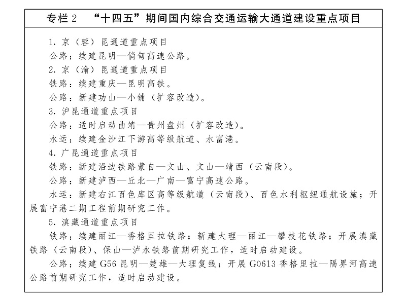 2.加快建設(shè)5條國內(nèi)綜合交通運(yùn)輸大通道。推動(dòng)京(蓉)昆、京(渝)昆、滬昆、廣昆通道鐵路提質(zhì)、公路擴(kuò)能,打通滇藏綜合交通運(yùn)輸通道,加密和優(yōu)化民航國內(nèi)航線,推進(jìn)右江百色庫區(qū)高等級(jí)航道(云南段)及百色水利樞紐通航設(shè)施建設(shè),形成高效發(fā)達(dá)的出省綜合交通運(yùn)輸通道,全面支撐昆明—京津冀、昆明—長三角、昆明—粵港澳大灣區(qū)、昆明—西藏4條國內(nèi)綜合交通經(jīng)濟(jì)廊帶建設(shè)。