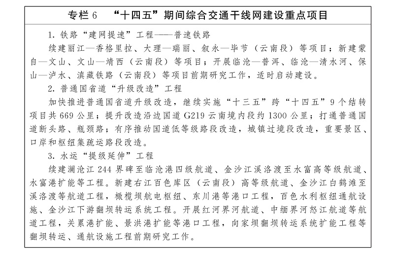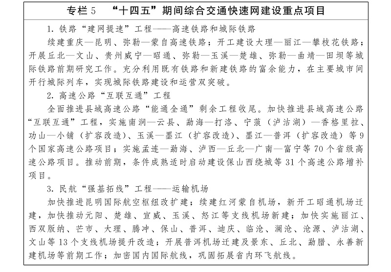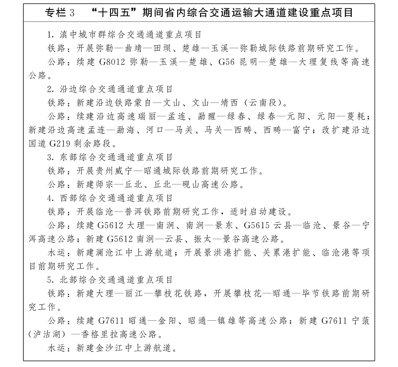 3.加快建設(shè)5條省內(nèi)綜合交通運(yùn)輸大通道。圍繞“暢通綜合通道、完善方式配置”,貫通鐵路、公路通道,統(tǒng)籌推進(jìn)通道內(nèi)重點(diǎn)項(xiàng)目建設(shè),全面支撐滇中城市群、沿邊、滇東北—滇東南、滇西—滇南、滇西北—滇東北5條省內(nèi)綜合交通經(jīng)濟(jì)軸線建設(shè)。