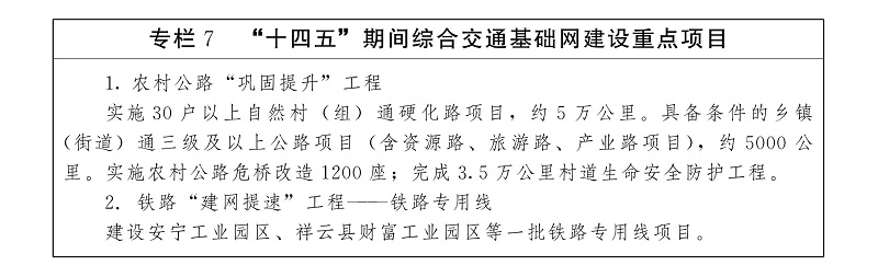 推動(dòng)公路網(wǎng)、鐵路網(wǎng)、航空網(wǎng)、水運(yùn)網(wǎng)、郵政網(wǎng)深度融合,構(gòu)建綜合交通基礎(chǔ)設(shè)施“3張網(wǎng)”,進(jìn)一步完善綜合交通經(jīng)濟(jì)走廊骨架網(wǎng),實(shí)施綜合交通八大重點(diǎn)工程。