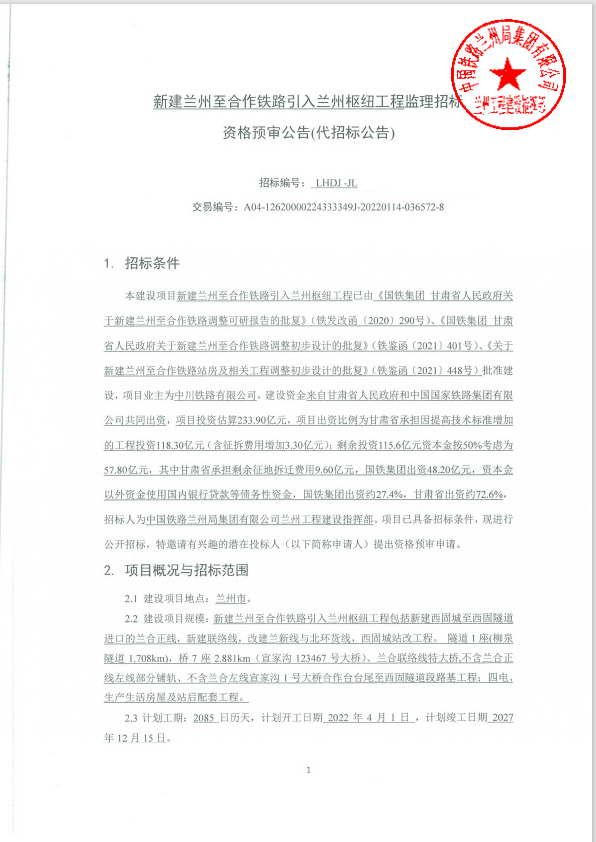 近日,甘肅省公共資源交易中心發(fā)布了《蘭州至合作鐵路引入蘭州樞紐工程監(jiān)理招標 資格預(yù)審公告》。