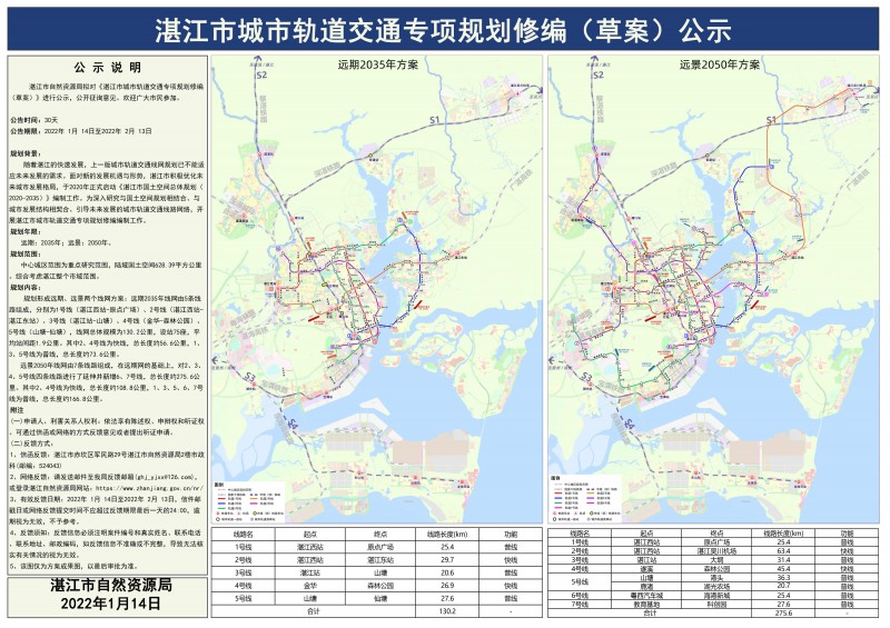近日,湛江市自然資源局?jǐn)M對(duì)《湛江市城市軌道交通專項(xiàng)規(guī)劃修編(草案)》進(jìn)行公示,公開征詢意見(jiàn)。