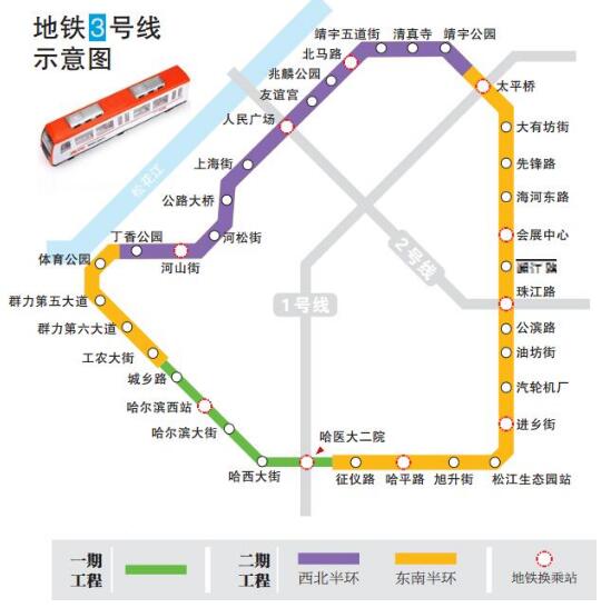 哈爾濱地鐵三號(hào)線二期工程已于3月13日全面復(fù)工。工程一階段即東南半環(huán)包括已運(yùn)營(yíng)的醫(yī)大二院站,沿保健路向東,然后向北沿通鄉(xiāng)街、紅旗大街至已運(yùn)營(yíng)的太平橋站,和沿群力大道的體育公園站、沿麗江路的群里第五大道至工農(nóng)大街站組成,包含19座車站,19個(gè)區(qū)間,工期5年(2016年4月至2021年3月);工程二階段即西北半環(huán)由太平橋站起,向西沿靖宇街、北馬路、友誼路至公路大橋后,沿哈藥路、前進(jìn)路、康安路、群力大道至體育公園站,包含12座車站,13個(gè)區(qū)間,工期5年(2018年4月至2023年3月)。