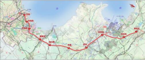 津?yàn)H高鐵線路起自京津城際鐵路延伸線濱海站,經(jīng)天津市濱海新區(qū)、河北省滄州市、山東省濱州市、東營市、濰坊市,終至濟(jì)青高速鐵路濰坊北站,全長約348.9公里,設(shè)站10座。