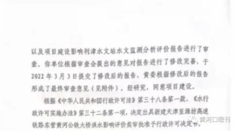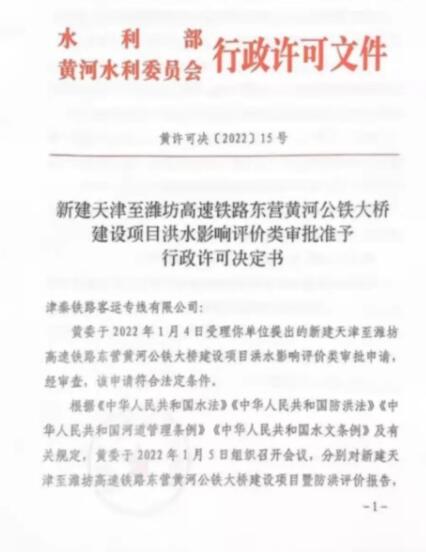 3月7日,水利部黃河水利委員會(huì)下發(fā)《新建天津至濰坊高速鐵路東營黃河公鐵大橋建設(shè)項(xiàng)目洪水影響評(píng)價(jià)類審批準(zhǔn)予行政許可決定書》。決定書指出,黃委于2022年1月5日組織召開會(huì)議,分別對(duì)新建天津至濰坊高速鐵路東營黃河公鐵大橋建設(shè)項(xiàng)目暨防洪評(píng)價(jià)報(bào)告,以及項(xiàng)目建設(shè)影響利津水文站水文監(jiān)測分析評(píng)價(jià)報(bào)告進(jìn)行了審查。