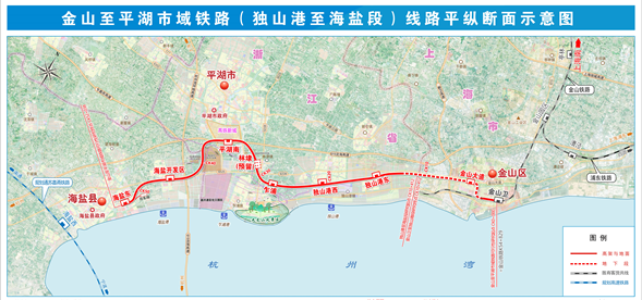 項目自上海金山鐵路金山衛(wèi)站引出,終至海鹽縣,全長52.0公里,其中浙江段長41.6公里,共設(shè)獨山港東站、獨山港西站、乍浦站、林埭站(預留)、平湖南站、海鹽開發(fā)區(qū)站、海鹽東站7個車站。